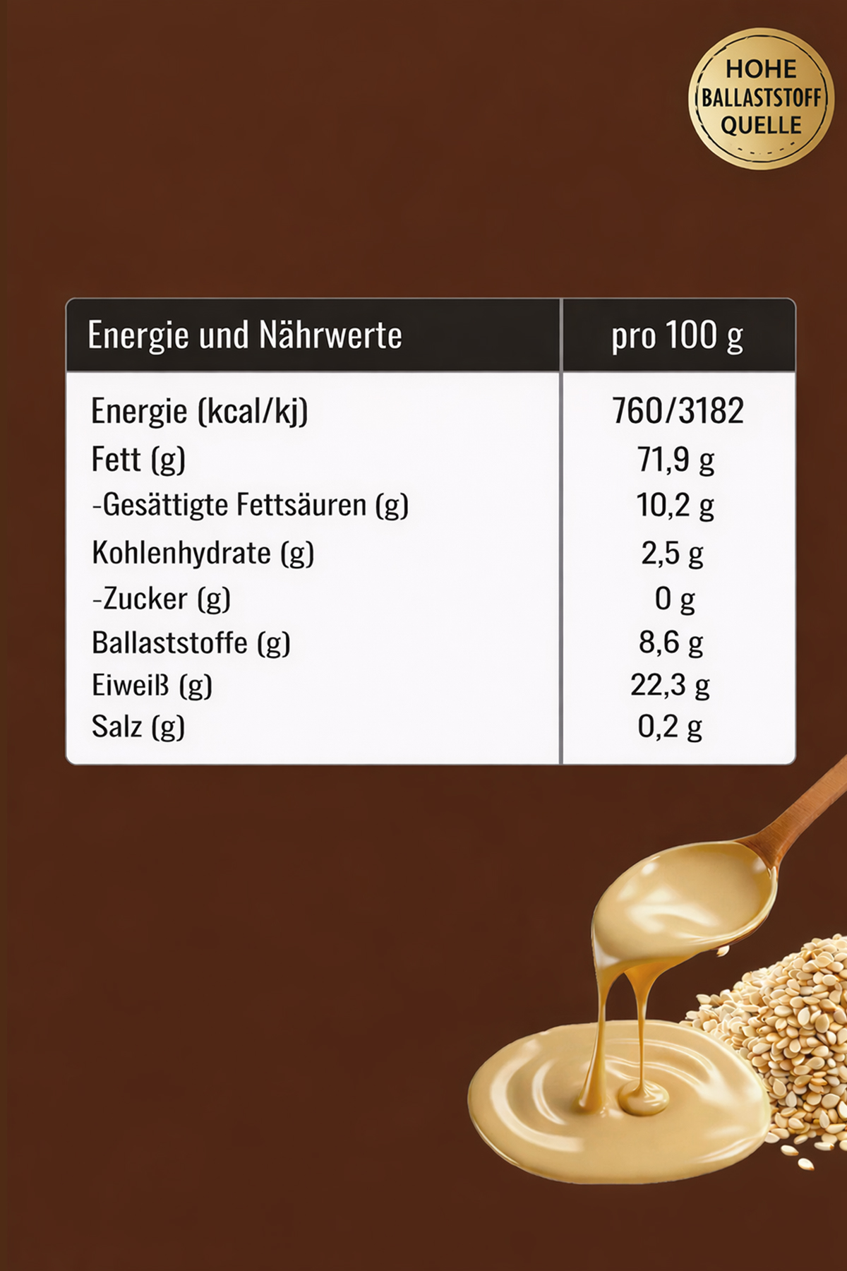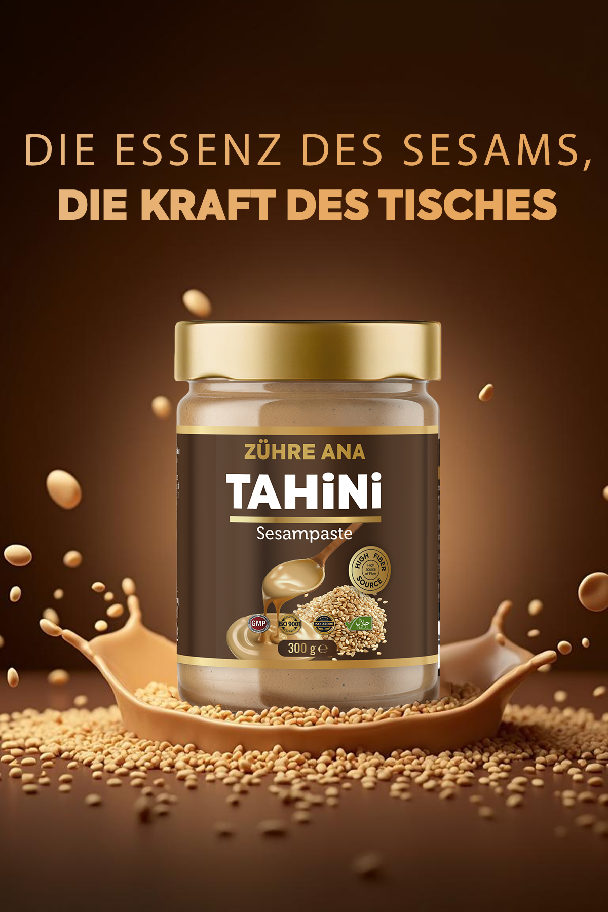 Dieses Tahin wird aus geröstetem Sesam hergestellt. Es enthält 100 % Sesam. Es enthält keine Zusatzstoffe. Es zeichnet sich durch eine charakteristische, dickflüssige Konsistenz und ein intensives Aroma aus. Die sich auf dem Tahin bildende Ölschicht ist eine natürliche Reaktion und kein Anzeichen für Verderb. Es wird empfohlen, das Produkt vor Gebrauch umzurühren. Bei einer Öltrennung kann durch Einlegen der geschlossenen Verpackung in lauwarmes Wasser und anschließendes Umrühren eine homogene Konsistenz erreicht werden. Geeignet für den direkten Verzehr. Enthält kein Schweinefleisch und keine Schweineprodukte. Vor Sonnenlicht geschützt, kühl und trocken lagern. Nach dem Öffnen sollte der Kontakt des Produkts mit Wasser vermieden werden.