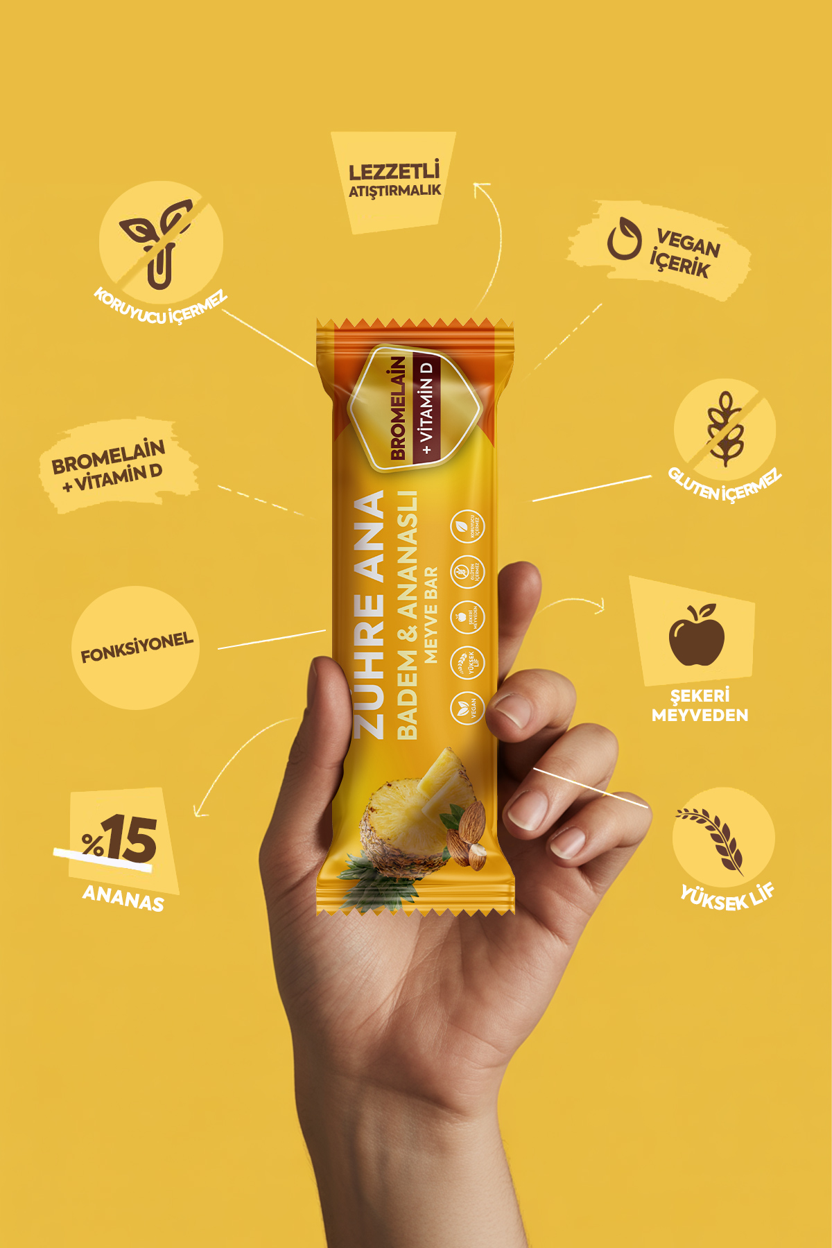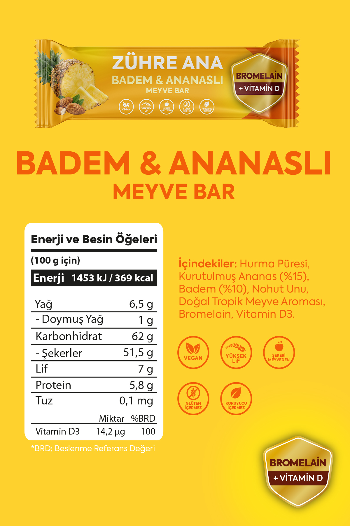 Zutaten: Dattelpüree, getrocknete Ananas (15 %), Mandeln (10 %), Kichererbsenmehl, natürliches tropisches Fruchtaroma, Bromelain, Vitamin D3