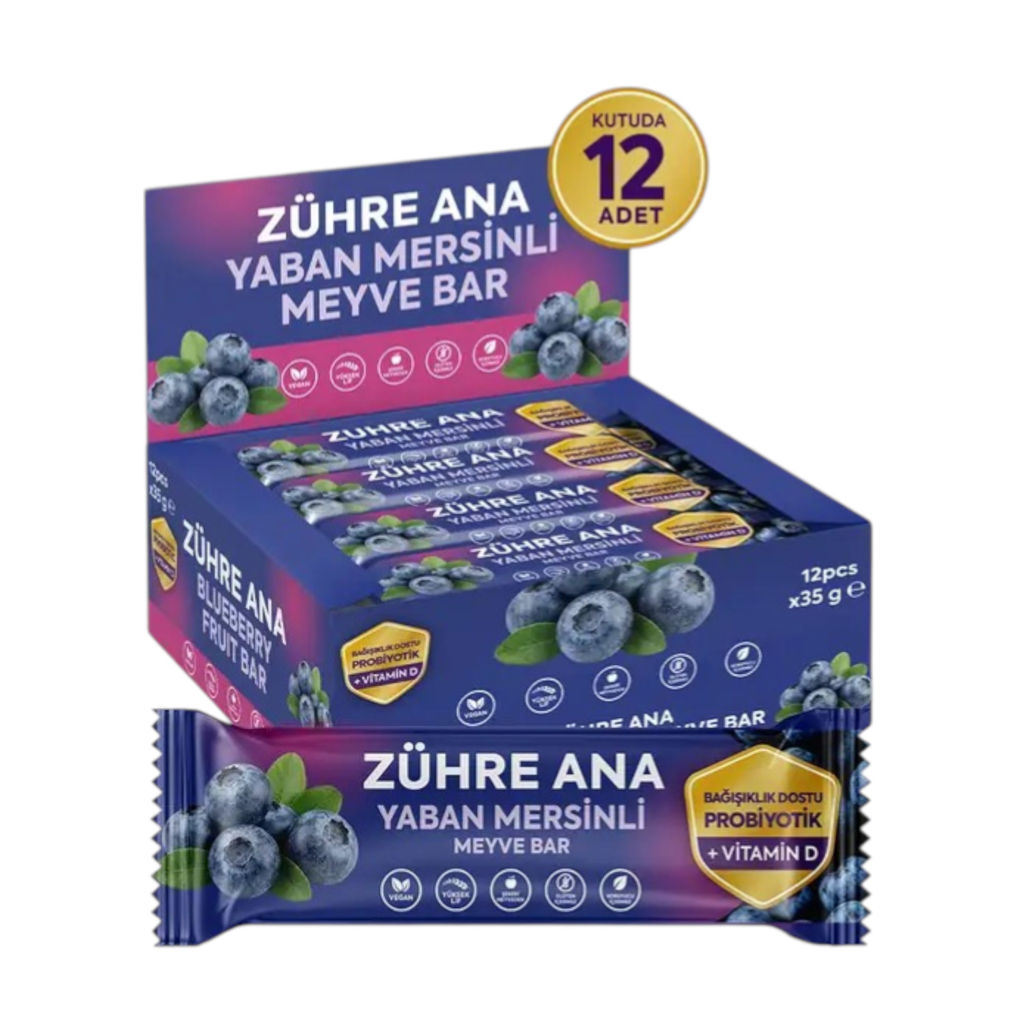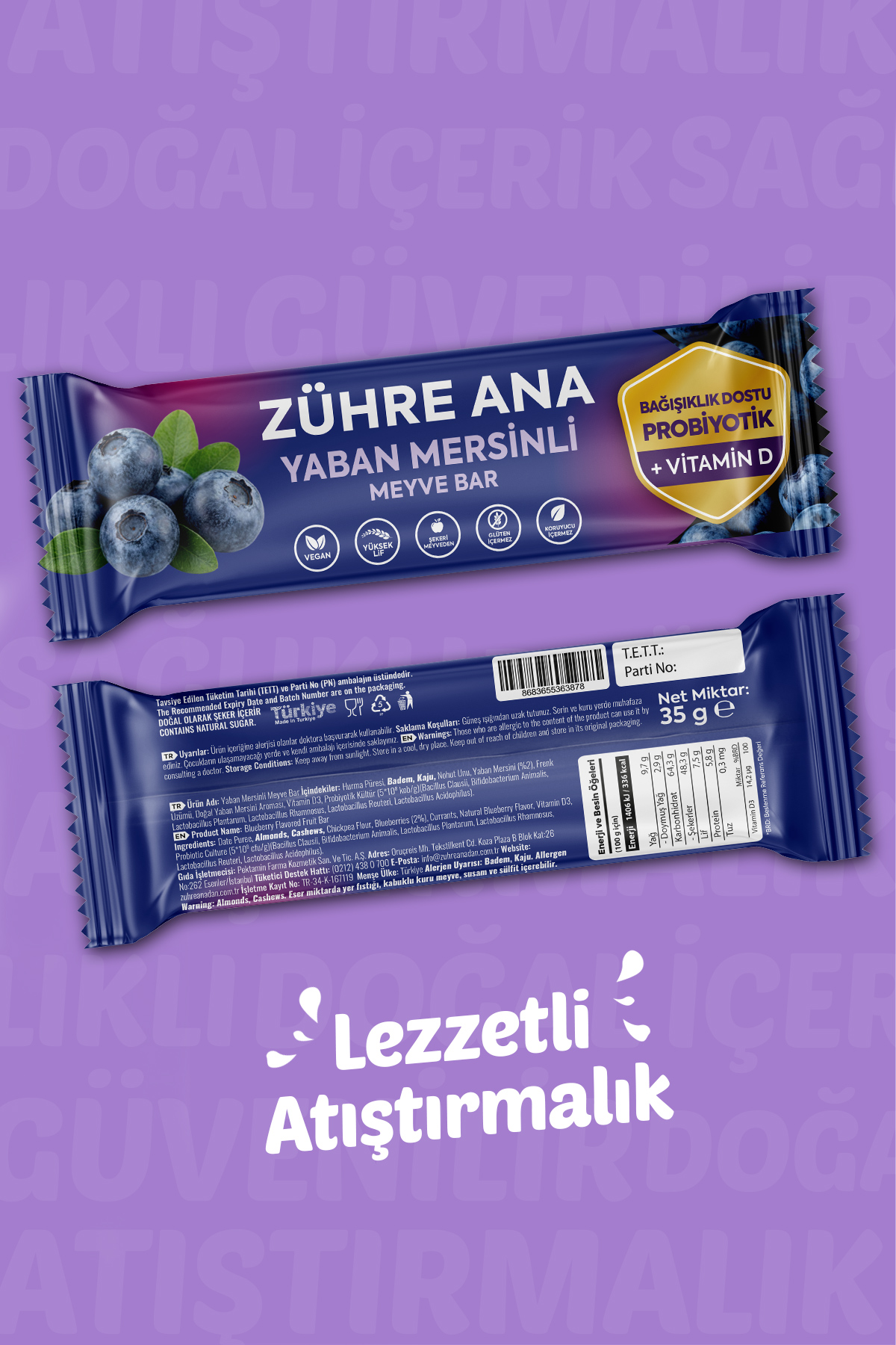 Zutaten: Dattelpüree, Mandeln, Cashewnüsse, Kichererbsenmehl, Heidelbeeren (2 %), Johannisbeeren, natürliches Heidelbeeraroma, Vitamin D3, probiotische Kultur (5×10⁸ KBE/g) (Bacillus Clausii, Bifidobacterium Animalis, Lactobacillus Plantarum, Lactobacillus Rhamnosus, Lactobacillus Reuteri, Lactobacillus Acidophilus)